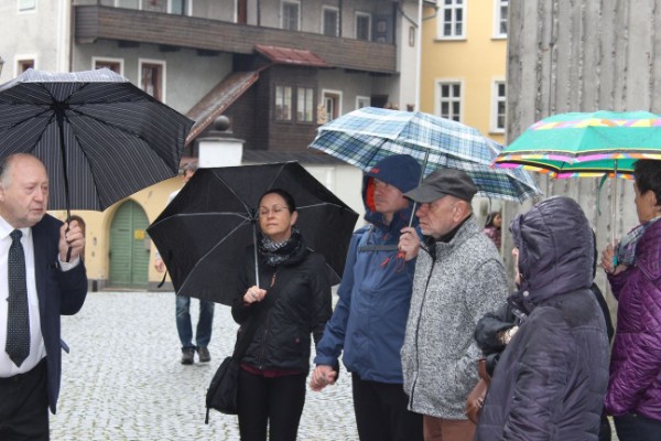 Der nächste Tag begann mit dem berühmten Salzburger Schnürlregen. Deswegen wurde auf die Führung durch die Hellbrunner Wasserspiele verzichtet. Wir holten dort Prof. Sallaberger ab und fuhren die Staatstrasse 159 entlang der Salzach nach Hallein. Er erklärte uns die Vorliebe der Saudis als Wohnsitz für diese Gegend mit: " Weil es hier so schön regnet." Am Schöndorferplatz in Hallein, vollständig von Renaissancefassaden umgeben, stiegen wir aus dem Bus. Die Innenstadtflucht hatte dort zu einem völligen Leerstand geführt, bis das Kolpingswerk eine Seite komplett aufgekauft und wieder mit Leben erfüllt hat. Ein kurzer Weg führte uns zum Wohnhaus Franz Grubers, dem Komponisten des Liedes Stille Nacht, Heilige Nacht. Das kleine Museum, wo wir angemeldet waren, sollte uns Schutz vor dem Regen geben. Doch die Anmeldung war im Tourismusbüro mit dem Keltenmuseum Hallein verwechselt worden, das Museum geschlossen.